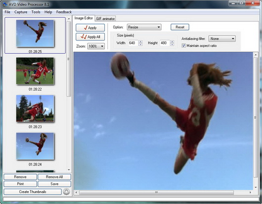 AVD Video Processor - является легким в использовании инструментом для захвата кадров из видео файлов и создания профессионально выглядящих GIF анимаций. Приложение, работает практически со всеми популярными видео и графическими форматами, доступные в настоящее время, включая AVI, MPEG, MPG, DivX, а также FAX, TIFF, GIF, JPEG, PNG, BMP, PCX, PDF, PS, WBMP , DIB, RLE, TGA, PBM, PGM и PPM, PDF, PostScript (PS, EPS), Adobe Photoshop PSD. Что позволяет обрабатывать видео без необходимости конвертировать его в подходящий формат во внешних приложениях.