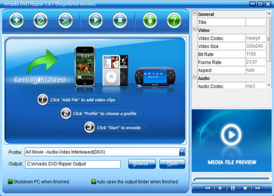 Amadis DVD Ripper - граббер видео DVD и конвертер в VCD, MPEG1, SVCD, MPEG2, AVI, Divx, MPEG4 форматы, поддержка пакетного режима работы, выбор и настройка кодеков, выбор и настройка параметров сохранения: размеры картинки, качество аудио и видео, битрейд, фреймрейд и другие. Программа очень проста в обращении и имеет понятный интерфейс, так же достаточно быстро конвертирует ролики с хорошим качеством.