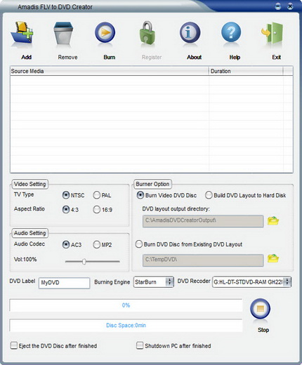 Amadis FLV to DVD Creator - программа, для создания видео DVD из других видео файлов. Поддержка AVI, DIVX, XVID, WMV, ASF, ASX, H264, H263, MPEG, DV, VCD, SVCD, MOV, QT, MKV, SWF, FLV, RM, RMVB и других видео форматов; поддержка PAL и NTSC систем, и 4:3 или 16:9 размеров экрана; создание образа на жестком диске и прожиг готового результата на DVD диск; поддержка большинства пишущих DVD R/RW приводов и DVD дисков.