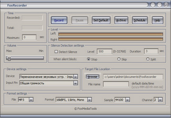 FoxRecorder - инструмент предназначенный для записи аудио файлов. Программа предоставляет возможность сохранять звук в MP3, WMA, OGG, VOX, AU, AIFF форматы с кассет, DVD, ТВ, концертов, интернет-радио, видеоигр и любых других источников звука, который воспроизводится на вашем ПК.