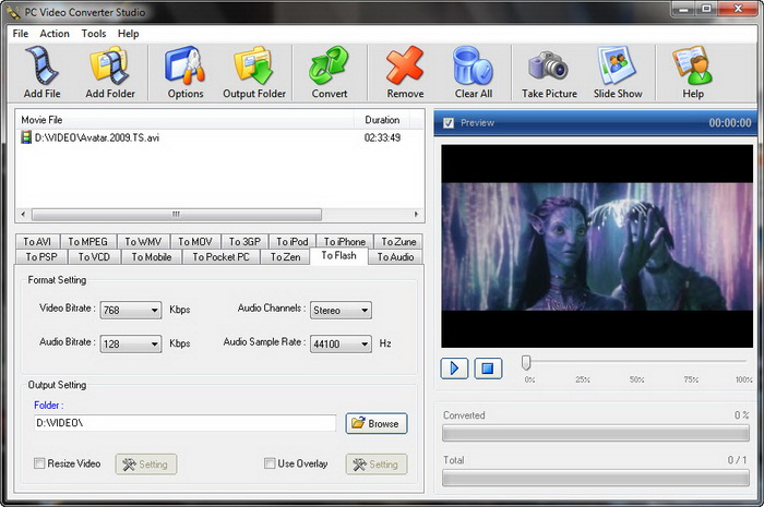 PC Video Converter Studio - программа для конвертирования видеофайлов между AVI, DivX, XviD, MPEG1, MPEG2, VCD, SVCD, DVD, WMV, ASF, MOV, 3GP, 3G2, iPod, iPhone, Zune, PSP, Mobile, Pocket PC, Zen, Flash video, M4V и MP4 форматами. Среди основных возможностей программы можно выделить пакетный режим преобразования всех поддерживаемых форматов, поддержка различных видео кодеков, изменение размера видео, частоты смены кадров и битрейта, извлечение из видеофайлов звуковых дорожек, вставка логотипов, создание слайд-шоу и стоп-кадров.