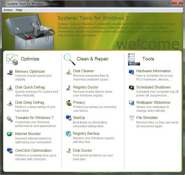 Systerac Tools - программа для настройки системы. Она объединяет в себе набор из 16 утилит, среди которых: инструмент для оптимизации дискового кэша и системного реестра, утилита для освобождения дискового пространства от ненужных файлов, программа для анализа состояния жесткого диска и устранения ошибок, утилита, позволяющая оптимизировать и ускорить интернет-соединение за счет изменения скрытых настроек.