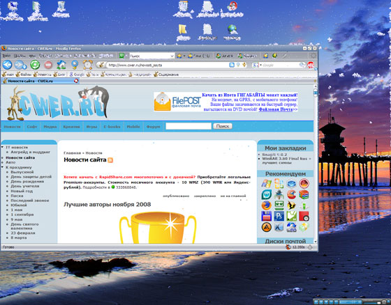 Что-то вроде замены обоям рабочего стола: падающий снег, скапливающийся в сугробы на открытых окошках и внизу экрана. После установки программы на вашем Рабочем столе начнется настоящий снегопад, периодически пронесутся сани с оленями и Санта-Клаусом, а еще чинно пройдет белый медведь. Ну чем не новогодняя сказка?!