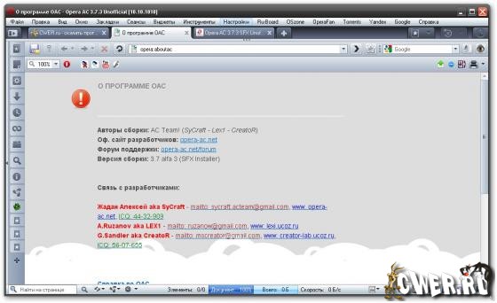 В отличие от мнений некоторых, команда AC Team не вмешивается в исходный код браузера Opera, и никакими средствами не видоизменяет его. Мы лишь стараемся по мере возможности добавлять в браузер авторские утилиты, улучшать открытые файлы браузера (файлы конфигурации), и интегрировать те или иные сервисы которые значительно облегчают работу в сети Интернет!