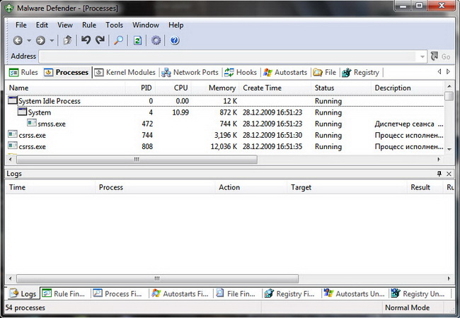 Malware Defender - программа для защиты системы от внешних вторжений, возникающих после установки в систему различного вредоносного программного обеспечения. В программе имеется несколько модулей таких, как менеджер правил приложений, обзор запущенных процессов, редактор реестра, обзор автозапуска программ, файловый обозреватель и т.д. Достоинствами программы являются низкое потребление системных ресурсов и возможность распознавать и пресекать попытки проникновения в систему таких типов вредоносных программ, как трояны, черви, рекламные модули и клавиатурные шпионы. Программа также имеет встроенный детектор руткитов, позволяющий производить их анализ и удаление из системы. Malware Defender отслеживает все скрытые системные процессы и своевременно уничтожает процессы, инициированные вредоносными программами.