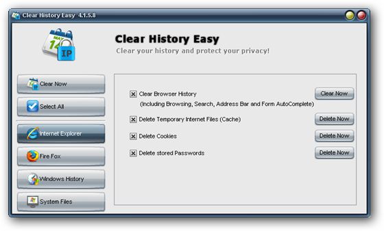Clear History Easy эффективно очистит cookies, кеш браузеров, введённые адреса и ссылки, а также очистит историю работы пользователя с более чем сотней самых популярных программ - офисные пакеты, архиваторы, проигрыватели и прочее. Она может стереть историю деятельности десятка программ, таких как Firefox, Internet Explorer, Windows Media Player, Yahoo, MSN и Google и т.д. Программа может также автоматически очищать Корзину, очистить буфер обмена и многое другое.