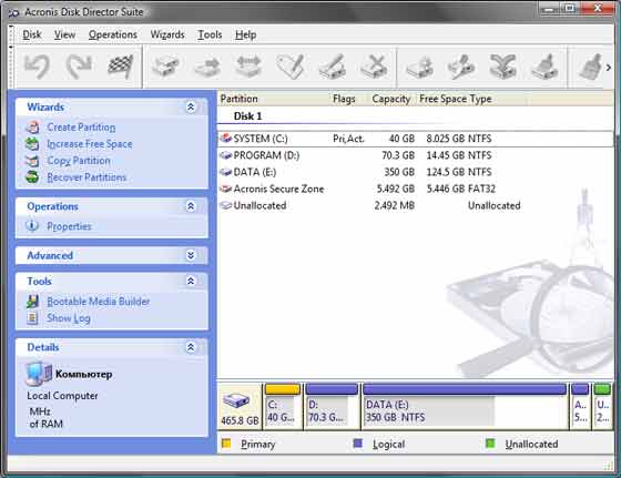 Acronis Disk Director Suite предоставляет пользователю два режима работы. В "Автоматическом режиме" операции выполняются с помощью Мастеров Acronis Disk Director Suite. В этом режиме работы даже самый неопытный пользователь сумеет шаг за шагом выполнить операции над разделами диска, руководствуясь исчерпывающими инструкциями. В "Ручном режиме" опытному пользователю доступны все операции Acronis Disk Director Suite, в том числе, сравнительно редко выполняемые. Переключать режимы работы программы можно в любой момент, с помощью пунктов меню "Вид".