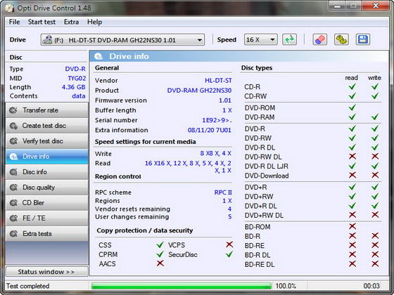 Opti Drive Control — программа для тестирования производительности оптических приводов. Программой поддерживаются все известные на текущий момент типы дисков, включая CD, DVD и Blu-Ray. С помощью этой утилиты вы сможете произвести тестирование скорости чтения и записи дисков, создавать тестовые диски и проверять качество записи, а также получать детальную информацию о дисках и приводах. В дополнение, программа позволяет форматировать и стирать информацию с перезаписываемых дисков. Данная программа является продолжением ранее известной утилиты NERO CD-DVD Speed. Результаты тестирования могут быть сохранены в формате HTML в качестве отчета и в формате CSV для сохранения графиков тестирования.