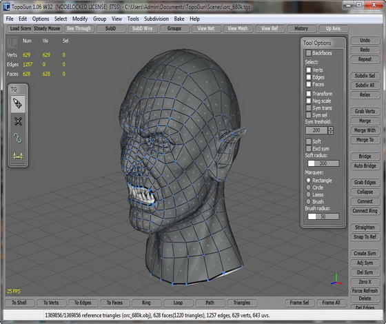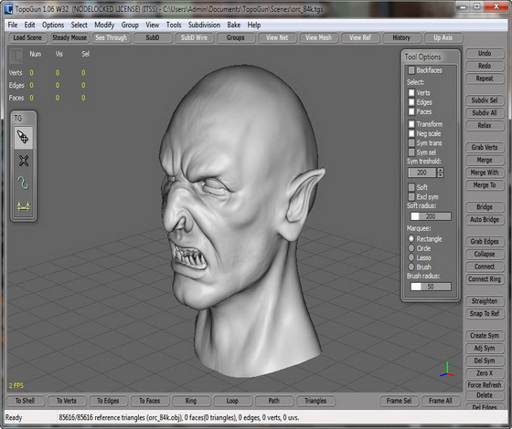 TopoGun - программа ретопологии, предназначена для построения низко полигональной модели по поверхности высоко полигональной, отсканированной с помощью 3D сканера или созданной в среде Zbrush, Mudbox, и запекания текстур. Можно создавать новую сетку путем добавления вершин, либо рисуя топологию специальным инструментом прямо по hipoly. Программа поддерживает формат .obj.