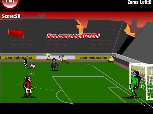 Вам предстоит играть не на жизнь, а на смерть против зловещих зомби-футболистов. Сначала нужно ликвидировать всех защитников и вратаря, после чего забить гол в пустые ворота. После каждого уровня можно увеличить силу удара или скорость подачи мячей. Кстати, можно играть за любую из команд Английской Премьер Лиги.