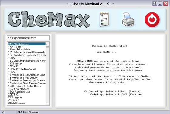 CheMax - наибольшая из известных на данный момент программ, которые являют собой базу данных с кодами для игр. Простой и красивый интерфейс, малый размер, и при этом огромное количество представленных игр. Особенностью базы является отсутствие в ней хинтов и прочей “отсебятины“, вашему вниманию представлены только коды (cheats, hex-cheats) и пароли (passwords).