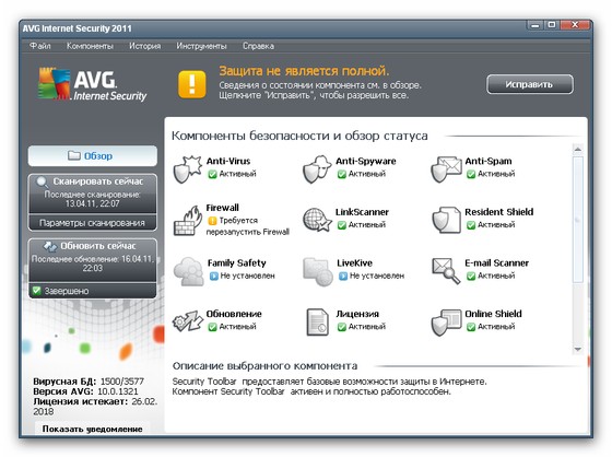 AVG Internet Security - мощный пакет приложений компании GrisоfТ для защиты компьютера от всевозможных сетевых угроз: вирусов, троянов, червей, шпионского и рекламного обеспечений, хакеров и спама. В AVG Internet Security входят модули: Anti-Virus, Anti-Spyware, Anti-Spam и Firewall. Программа легка в использовании, имеет функцию автоматического обновления через Интернет и работы по расписанию. Программа AVG Internet Security 2011 имеет несколько уровней защиты, которые обеспечивают безопасность при совершении покупок, работе с интернет-банком, общении в социальных сетях и просмотре веб-страниц.