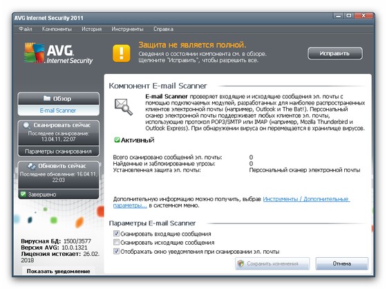 4. Почтовая защита. AVG проверяет весь почтовый трафик, и подключается к таким почтовым клиентам, как: MS Outlook, The bat!, Eudora, и другим SMTP/POP3 почтовым клиентам, таким как Outlook Express. Также поддерживается проверка SSL-трафика.