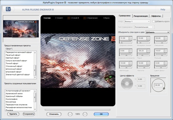 Engraver III - это инструмент, с помощью которого можете создавать стилизованные гравюры всего за несколько минут! Экспериментируйте с широким разнообразием геометрических узоров и модификаций линий, используйте несколько слоев, чтобы создать сложные эффекты, изменяйте цвета линий или добавляйте шум и элемент случайности, чтобы ваша гравюра смотрелась, словно работа сделанная вручную. При окончательной обработке можно выбрать в качестве фона цвет бумаги и текстуры и даже добавить эффекты имитирующие тиснение.