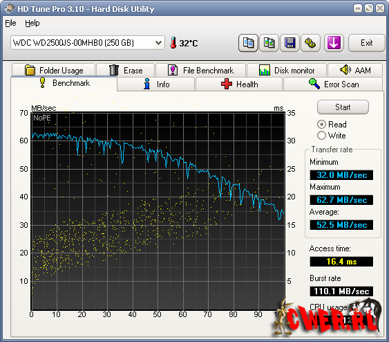 HD Tune - утилита, предназначенная для детального тестирования работоспособности и производительности жестких дисков с различными интерфейсами, а также карт памяти и flash-дисков. Программа контролирует и отображает в графическом формате такие параметры накопителей, как скорость передачи данных, время доступа, уровень загрузки процессора, температуру винчестера, показывает в виде сводной таблицы данные S.M.A.R.T, позволяет сканировать жесткие диски и другие устройства хранения информации на предмет наличия ошибок, выдает информацию о версии firmware, серийном номере, объеме диска и его кэша, возможном и активном режимах передачи данных и т.п.