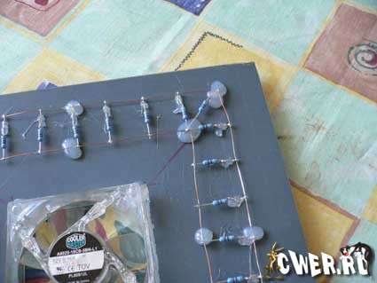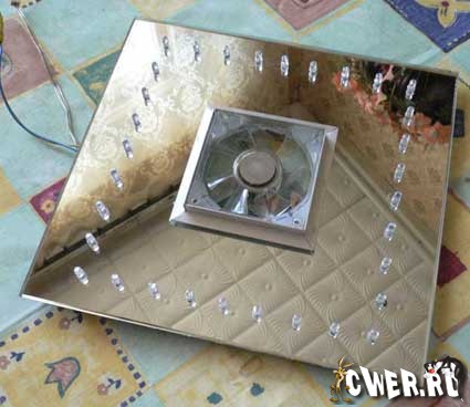 На этой фотографии изображено зеркало с установленными светодиодами и привинченным куллером.