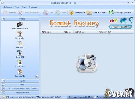 FormatFactory - многофункциональный конвертер различных файлов мультимедиа. Имеет рад дополнительных функций, превращающих FormatFactory в универсальный инструмент для работы с мультимедийными файлами разных форматов. Поддерживается конвертация популярных видеоформатов в MP4, 3GP, MPG, AVI, WMV, FLV, SWF, а также конвертация аудиоформатов в MP3, WMA, MMF, AMR, OGG, M4A, WAV. В FormatFactory есть функция преобразования изображений в форматы JPG, BMP, PNG, TIF, ICO, GIF, PCX, TGA. Среди дополнительных возможностей FormatFactory есть такие, как увеличение и вращение изображений, присвоение им тегов, а также восстановление поврежденных аудио и видеофайлов.