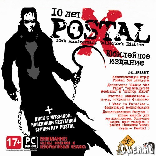 Одна из самых сумасшедших игр всех времен и народов - Postal - возвращается в новом обличье! Внутри этого коллекционного издания - оригинальная игра, абсолютно все дополнения к ней, плюс эксклюзивный диск с музыкой и две игры созданные фанатами: Eternal Damnation, A Week in Paradise.