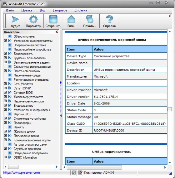 WinAudit - программа для проведения анализа конфигурации компьютера и установленного на нем программного обеспечения, а также проверки сетевых настроек, конфигурации системы безопасности и т.д. Работает без инсталляции, выдает подробный отчет в своем окне с возможностью сохранить его в форматах TXT, HTML, CSV или PDF.