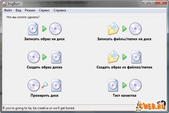 ImgBurn - утилита для записи образов дисков. Эта небольшая программа обладает всеми необходимыми функциями для прожига практически любых образов CD/DVD дисков. В ImgBurn имеются еще ряд других функций, которые позволяют открывать/закрывать лоток привода, осуществлять поиск в Интернет новых версий прошивки для данного устройства записи, изменять метку ISO-образа, блокировать/разблокировать открытие лотка привода. Кроме того, программа умеет очищать диски двумя способами - быстрым и полным. Главной ее особенностью является поддержка большого количества приводов различных производителей. Программа имеет ряд настроек, где можно задать ассоциацию с поддерживаемыми расширениями файлов-образов (BIN, GCM, LST, UDI, CDI, FI, MDS, CDR, IMG, NRG, DVD, ISO, PDI), выбрать интерфейс записи (ASPI, ASAPI, SPTI) и звуковые схемы.