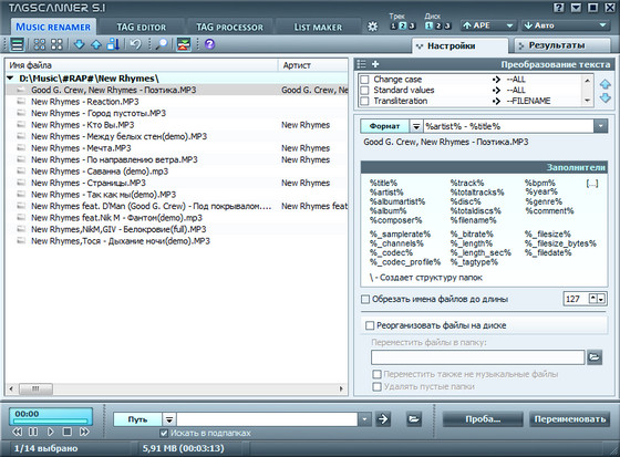 TagScanner - мощная программа для организации и управления музыкальными архивами. TagScanner переименовывает музыкальные файлы различных форматов так, чтобы в их имени содержалось информация из тэгов. Также программа позволяет сгенерировать тэг по имени файла/директории или изменить значения необходимых полей в пакетном режиме. Программа имеет широкие возможности для получения информации об альбоме из онлайн баз, таких как freedb или Amazon. Поддерживаются теги ID3v1 и ID3v2, Vorbis Comments, APEv2, WMA и MP4. Универсальный редактор ТЭГов поможет быстро и удобно обработать необходимую информацию, в том числе в пакетном режиме. Также имеется в наличии простой, но удобный редактор плейлистов, позволяющий сохранять и читать листы в PLS/M3U и экспортировать их в HTML и таблицы Excel. Программа в большинстве случаев значительно облегчает жизнь, когда требуется привести в порядок свой музыкальный архив.