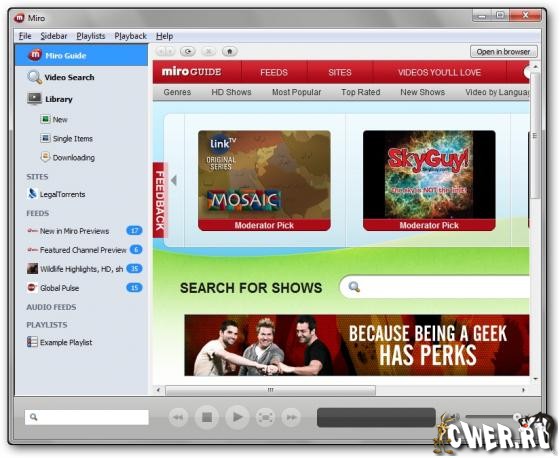 Miro - медиаплеер, основное предназначение которого - облегчение просмотра видео в Интернете. Плеер позволяет подключаться к видео-каналам, загружать видео-файлы на компьютер, просматривать ролики в полноэкранном режиме и т.д. Miro прост в работе и абсолютно бесплатен. Смотрите практически любое видео - Quicktime, WMV, MPEG, AVI, XVID и другие форматы. Просматривайте свою коллекцию, делайте плейлисты, сохраняйте порядок. Подписывайтесь на любые потоки RSS, содержащие видео, подкасты или видеоблоги. Исследуйте сотни свободных каналов при помощи встроенной программы передач.