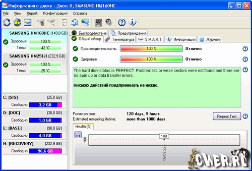 - Продвинутым пользователям пригодятся значения часов наработки и количество ошибок чтения/записи; интерпретирует значения производительности и состояния S.M.A.R.T. в процентный показатель для более простого понимания
