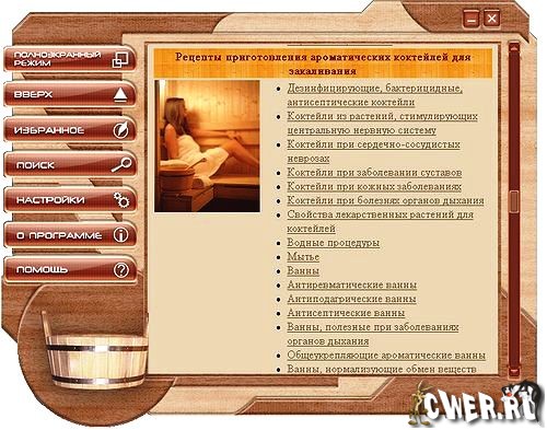 История бани насчитывает не одну тысячу лет. На этом диске представлена информация о строительстве, целебных свойствах и традициях бани. Вы найдете сведения по истории, мировым традициям бани, рецепты ароматных напитков, приемы массажа, свойства веников, устройство печей и многое другое.