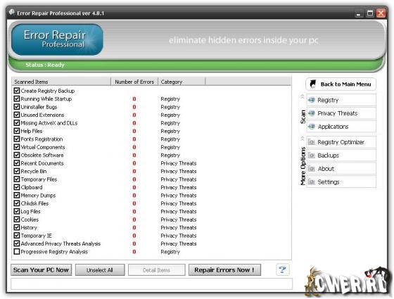 Error Repair Professional найдет неполадки в реестре, библиотеках данных системы и приложений, а также серьезные ошибки, допущенные пользователем, ставящие безопасность системы под угрозу. Ошибки в операционной системе могут привести ко многим неприятностям. Избежать их можно только одним способом — вовремя обнаружить и исправить. И то и другое поможет сделать данная программа. Сохранит ваш ПК, работающим без проблем. При помощи этой программы вы можете просканировать систему, идентифицировать, очистить и восстановить ошибки одним кликом мыши. Пошагово утилита просмотрит ваш реестр на предмет любых недействительных записей и представит вам список найденных ошибок реестра.