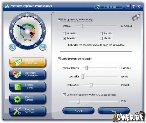 Memory Improve Professional – это один из полезных инструментов, который в информативной форме в виде прибора показывает текущее состояние потребления памяти и может автоматически или вручную производить дефрагментацию и освобождать для вас ресурсы в виде дополнительной памяти. Это в целом улучшит работу системы, уменьшит время её загрузки и повысит её производительность.