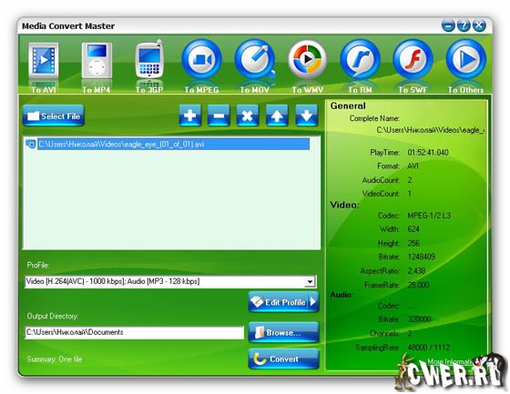 Media Convert Master - умеет конвертировать файлы из одного видеоформата в другой. Причём делает всё это с огромным числом популярных форматов: AVI, MP4, 3GP, MPEG, MOV, WMV, RM, SWF, AAC, AC3, MP2, MP3, AMR, WAV, VOB, ASF.