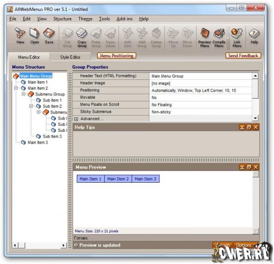 AllWebMenus - это приложение для создания DHTML/JavaScript навигационных меню для веб-сайтов, абсолютно не требующее от пользователя каких-либо навыков программирования. Оно создает любые кросс-браузерные, всплывающие и выпадающие меню, работающие во всех браузерах с поддержкой DHTML и на всех основных платформах (PC, MAC, Unix).