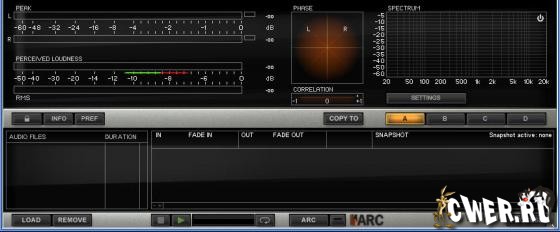 - Новая совершенная встроенная измеряющая секция с Peak, Perceived Loudness, Phase и RMS измерителями, а также анализатор спектра с Peak, RMS и Averaging индикаторами