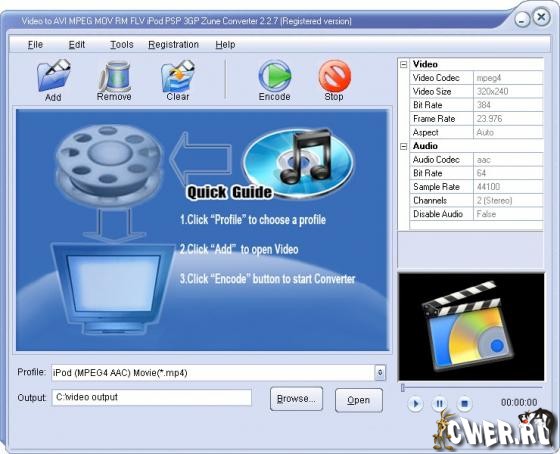 Поддерживает устройства: IPod, iPhone, Archos, PSP, PS3, Xbox360, Zune, Wii, Blackberry, мобильный телефон, MP4-плеер, плеер Creative Zen, HP IPAQ, Pocket PC, PDA и т.д. Конвертор очень прост в использовании, конвертирует быстро и с хорошим качеством.