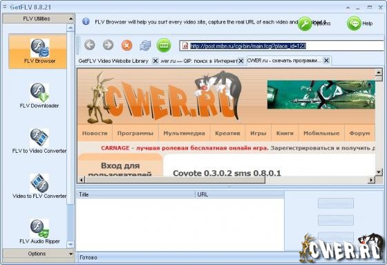 GetFLV Pro - это сборник из 7 модулей, который позволяет призводить весь спектр операций с .flv файлами. GetFLV Pro позволяет скачивать, управлять, конвертировать в различные форматы и из различных форматов, извлекать звук, восстанавливать и воспроизводить FLV видео.