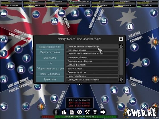 Детализированный пошаговый симулятор, в котором каждый шаг представляет период в два месяца. Каждые четыре года происходят выборы. В игре присутствует сложная внутренняя модель населения выбранной вами страны. Моделируется большое количество "избирательных групп", таких как Автомобилисты, Профсоюзы, Безработные, Богачи и пр. Симулятор позволяет игрокам одновременно быть в нескольких группах. Так, например, безработный бедный автомобилист будет под влиянием мнений сразу трех групп выборщиков.