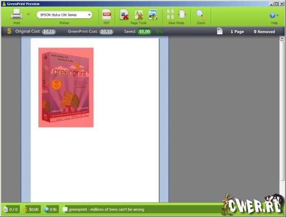 GreentPrint World для Windows обеспечивает экономию бумаги в ходе печати. Файл любого приложения выводится на печать через GreenPrint. Утилита, в свою очередь, автоматически удаляет из него белые и почти пустые страницы, а также страницы с изображением во весь лист. Затем программа дает команду принтеру. Чтобы удалить/вернуть страницу в печатаемый документ, необходимо дважды кликнуть по ней.