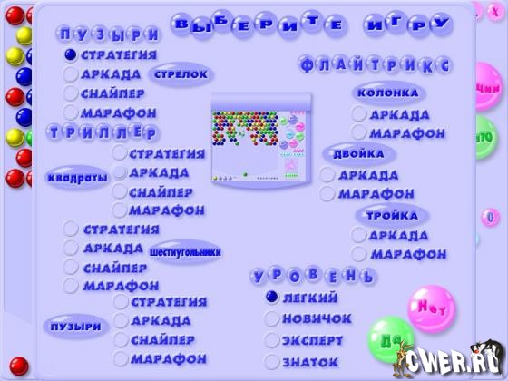 Самая полная версия всех игр Пузыри. Пузырьковое Ассорти состоит из 3 уникальных игр: пузыри, триллер и флайтрикс. Ваша цель - очистить как можно скорее поле от разноцветных пузырей. Каждая из игр имеет свои правила и режимы игры. Да, здесь есть из чего выбрать. 4 уровня сложности: легкий, новичек, эксперт и знаток.