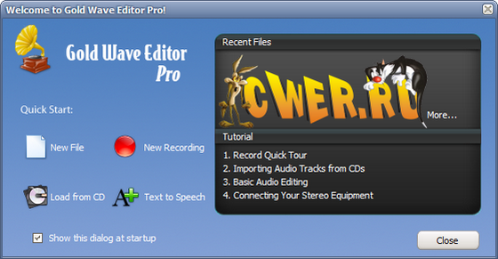 Gold Wave Editor - программа для записи, анализа и редактирования звука. Вы можете записывать звук с микрофона, подключенного к аудиокарте вашего компьютера, или любого другого устройства - радиоприемника, телевизора, аудио или видеомагнитофона, CD/DVD проигрывателя, системы спутникового ТВ и т.д Встроенный аудио редактор позволяет вам обрезать, делить и объединять ваши записи, добавлять к ним звуковые эффекты и фильтры. При помощи встроенного CD-риппера вы сможете копировать любимые треки с ваших аудио CD дисков и сохранять их с максимально возможным качеством в wav, wma, mp3 или ogg форматах.