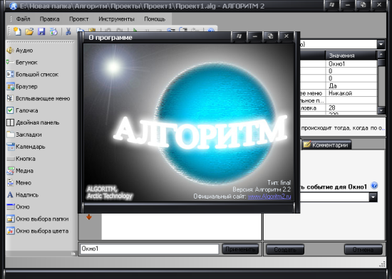 Алгоритм - это уникальная программа для создания программ. С ее помощью любой человек может создавать программы, не имея никаких знаний программирования. Современные объекты позволят вам создавать свои плеера, браузеры, текстовый редакторы, работать с файлами и папками, экраном компьютера, реестром, управлять мышкой и клавиатурой. Сделанную программу вы можете тут же сохранить в exe-файл и сразу же выложить в интернет или начать продавать, зарабатывая на своем уме! Интуитивный понятный интерфейс на русском языке + небольшой начальный урок и вы готовы творить! Не надо никаких знаний языков программирования, процесс создания приложений в "Алгоритме" основывается на логике, присущей каждому человеку.