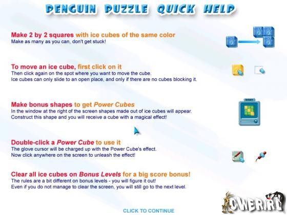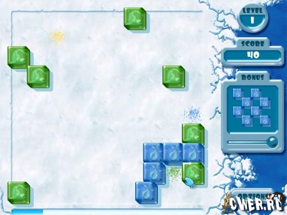 Ужасная буря налетела на Северный Полюс, превратив всех живых созданий в ледяные кубики! Только вы сможете освободить их из ледяных тюрем. Торопитесь – вы их последняя надежда! Ваша цель – освободить живых существ из ледяных кубиков, сдвигая кубики одного цвета вместе в квадраты 2х2 и таким образом взрывая их.