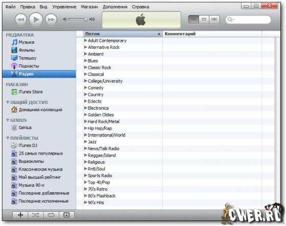 iTunes - мультимедийный комбайн производства компании Apple "все-в-одном". Позволяет слушать музыку, включая передаваемую интернет-радиостанциями, смотреть видео, конвертировать медиафайлы, а также записывать музыкальные компакт-диски и DVD. Основные черты: многополосный эквалайзер, визуализация звука, создание "интеллектуальных" списков прослушивания, кодирование без пауз и с наложением, нормализация уровня громкости и очень многое другое, включая очень хорошее звучание плеера, удобный интерфейс и возможность копирования композиций в память портативного плеера Apple iPod.