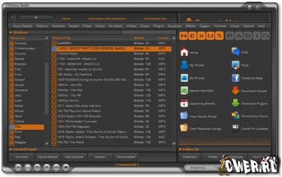 Nexus Radio – не просто плеер онлайн-радио, помимо целого ряда функций и стильного графического интерфейса, программа поддерживает 8000 интернет-станций. С помощью Nexus Radio можно не только слушать музыку любого стиля, но и записывать дорожки из эфира в MP3 формат. Никаких трудностей данная операция не вызовет. Трек записывается не только при нажатии на кнопку Record, но и в указанный период времени и даже день.