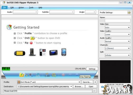 Мощная программа для копирования DVD, которая поможет Вам быстро преобразовать DVD в любой формат видео файлов. Программа совмещает функции DVD - риппера и DVD - аудиориппера, т.е. она сможет конвертировать DVD во все популярные форматы видео, такие как AVI, MPEG, WMV, DivX, RM, MOV, MP4, 3GP, 3G2, Xvid, ASF и т.п. и популярные аудио форматы - MP3, WAV, WMA, AAC, AC3, M4A, MP2, OGG. Поддерживает конвертацию для iPod, мобильных телефонов, PSP, DVD, MP3 и MP4 плееров.