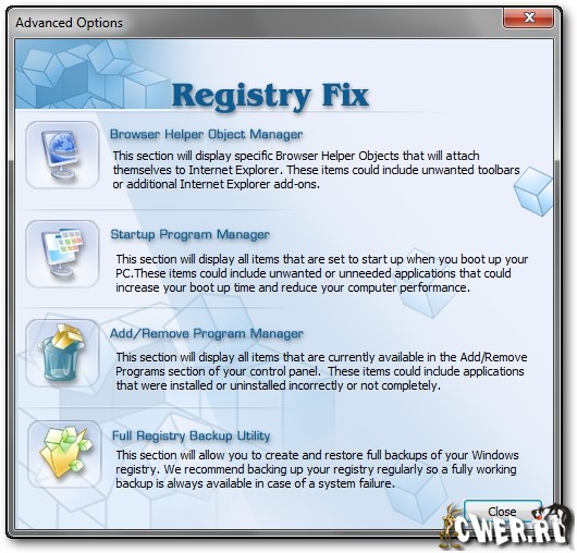 RegistryFix выявляет и устраняет ошибки в системном реестре Windows, причем делает это очень хорошо, и без необходимости перезагрузки компьютера для того, чтобы изменения вступили в силу. Список областей очистки реестра довольно широк: - программная область, - установка/удаление программ, - установленные шрифты, - совместно используемые файлы, - файлы помощи, - область автозагрузки программ, - системные сервисы и драйвера - ярлыки и т.д. Перед началом процесса чистки можно сделать резервную копию реестра.