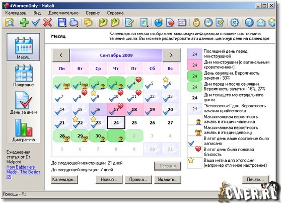 - отображает диаграмму, показывающую вероятность зачатия на тот или иной день менструального цикла;