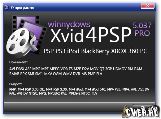 XviD4PSP 5.032 Pro - ранее был специализированной программой для конвертирования видео для iPOD, iPhone и Sony PSP, однако XVID4PSP оказалась столь хороша, что автор (между прочим, наш соотечественник) сделал из неё лучший (и одновременно самый простой!) в классе русскоязычный видеоконвертер, поддерживающий на входе любые видеофайлы, а на выходе: