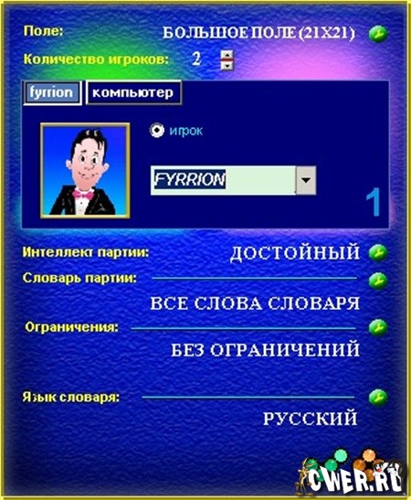 Вам не придется на бумажке считать очки, залезать под стол за упавшей буквой. Вы сможете поиграть всей семьей или оттачивать свое мастерство, играя с компьютером — он "знает" более 51000 слов (и словарь толкований для 43500 слов)!