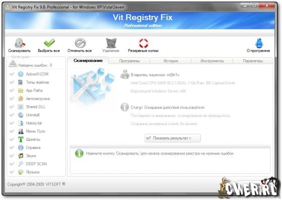 Vit Registry Fix - программа для очистки реестра от ненужных записей (ошибок). Так как после удаления програм в реестре оставляются различные ненужные записи, то со временем этих записей становится все больше и больше и это является причиной долгих задержек перед загрузкой програм, снижение общей производительности системы и других ошибок. Vit Registry Fix находит эти ошибки и разделяет их на категории (ActiveX\COM,Типы файлов, AppPath, автозагрузка, Shared DLL, Uninstall, History list, меню ПУСК, Шрифты, Справка, Звуки, Ключи Software (Deep scan) и дополнительно ищет битые ярлыки на дисках. Также есть возможность ручного удаления ключей из разделов Software (как для HKCU так и для HKLM), создания резервных копий перед удалением ошибок а также можно создать список исключения.