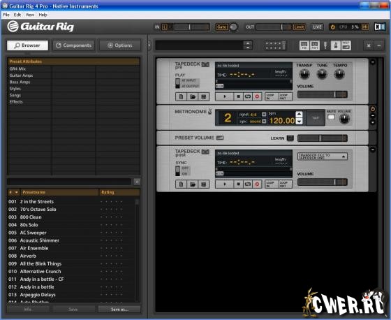 Guitar Rig Pro — профессиональное решение для записи электро- или бас-гитары на вашем компьютере. В состав этого мощного и логичного программного обеспечения входит множество точных копий аппаратных усилителей, кабинетов, микрофонов и эффектов. В четвертой версии программы представлено 2 новых усилителя, 4 новых невероятно гибких эффекта, а также новая революционная аппаратная комната для придания звучанию студийного качества. Перед музыкантами открываются возможности использования в своем творчестве 15 потрясающих гитарных и басгитарных усилителей, предельно точно воссозданных в программе благодаря технологии эмуляции лампового звучания Dynamic Tube Response. Сохранив в себе оригинальные схемы многоканальной обработки и все специфические характеристики, эти усилители способны не только передавать звучание их прототипов, но и обеспечить пользователя огромным арсеналом настроек звучания для любого жанра музыки.